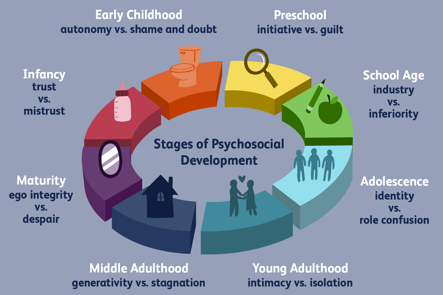 ശൈശവം മുതല് വാര്ദ്ധക്യം വരെ ഏതെല്ലാം വസ്ഥയിലൂടെ ഒരു ആരോഗ്യവാനായ വ്യക്തി കടന്നുവരുന്നു എന്നതിനെ ആസ്പദമാക്കി എറിക്ക് എറിക്ക്സണ് എട്ടു സ്റ്റേജുകളിലൂടെ (തട്ടുകളിലായി)- എറിക്ക്സണ്സ് സ്റ്റേജസ് ഓഫ് സൈക്കോസോഷ്യല് ഡെവലപ്പ്മെന്റല് സിദ്ധാന്താത്തില് സ്പഷ്ടമാക്കി. ഓരോ സ്റ്റേജിലും പുതിയ വെല്ലുവിളികളെ അഭിമുഖീകരിച്ച് എങ്ങനെ ആശയോടെ അല്ലെങ്കില് പ്രതീക്ഷയോടെ ഒരു വ്യക്തി വളര്ന്നുവരുന്നു, ഒപ്പം അവനോടുകൂടി ഉണ്ടാകുന്ന സ്വഭാവ സവിശേഷതകളും വ്യക്തിത്വ പ്രത്യേകതകളും ഈ തിയറിയില് എറിക്ക്സണ് പ്രതിപാദിച്ചിരിക്കുന്നു.